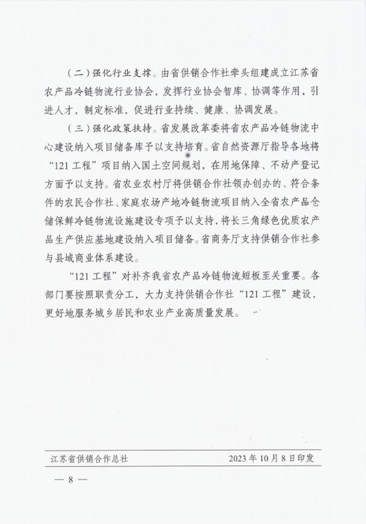 (三)強化政策扶持。省發展改革委將省農產品冷鏈物流中心建設納入項目儲備庫予以支持培育。省自然資源廳指導各地將“121工程”項目納入國土空間規劃,在用地保障、不動產登記方面予以支持。省農業農村廳將供銷合作社領辦創辦的、符合條件的農民合作社、家庭農場產地冷鏈物流項目納入全省農產品倉儲保鮮冷鏈物流設施建設專項予以支持,將長三角綠色優質農產品生產供應基地建設納入項目儲備。省商務廳支持供銷合作社參與縣域商業體系建設。