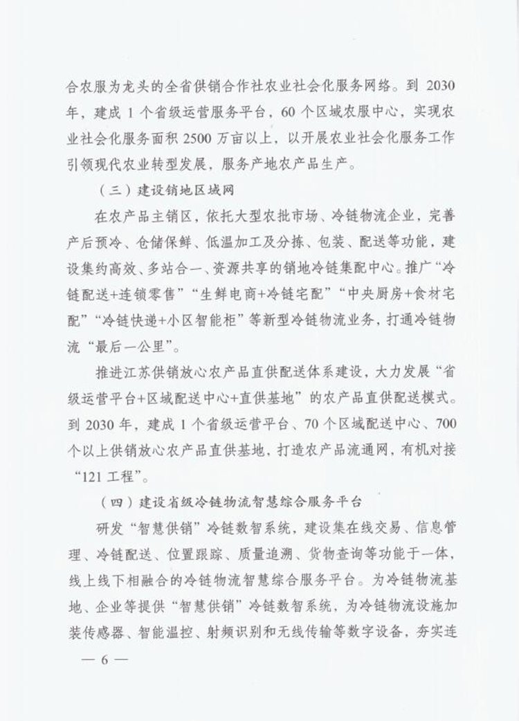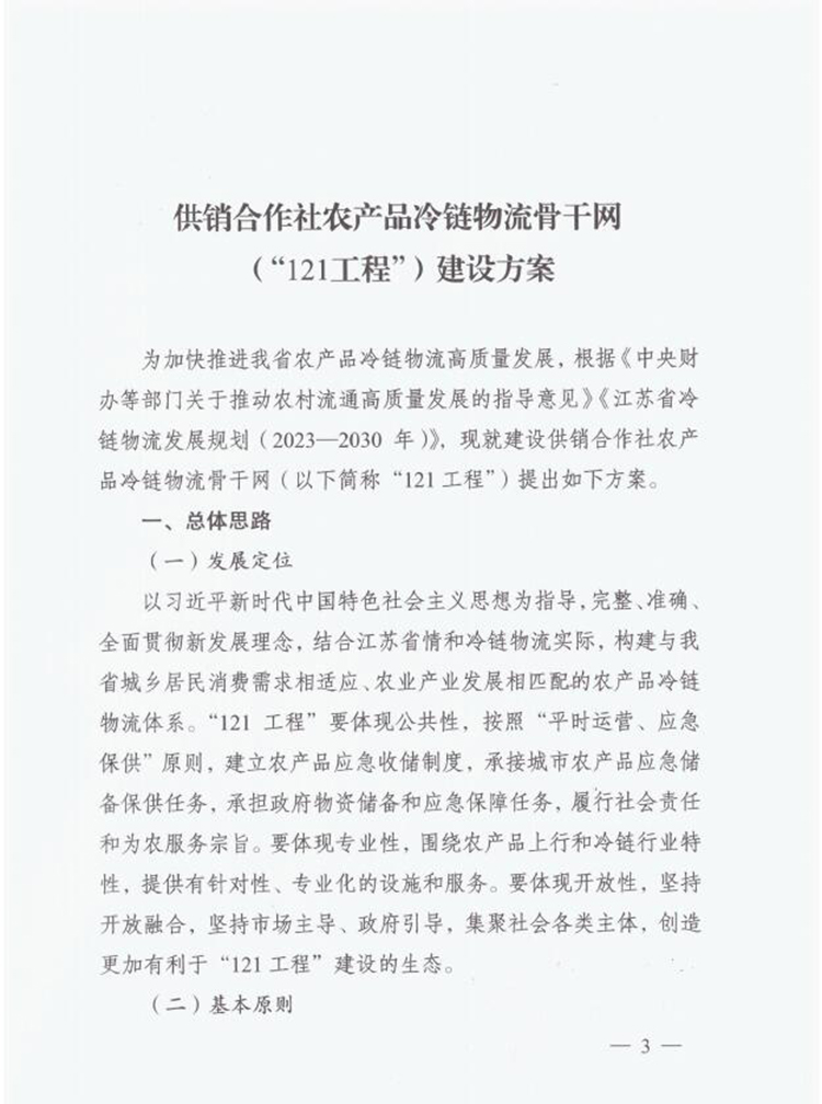 為加快推進我省農產品冷鏈物流高質量發展,根據《中央財辦等部門關于推動農村流通高質量發展的指導意見》《江蘇省冷鏈物流發展規劃(2023-2030年)》,現就建設供銷合作社農產品冷鏈物流骨干網(以下簡稱“121工程”)提出如下方案。