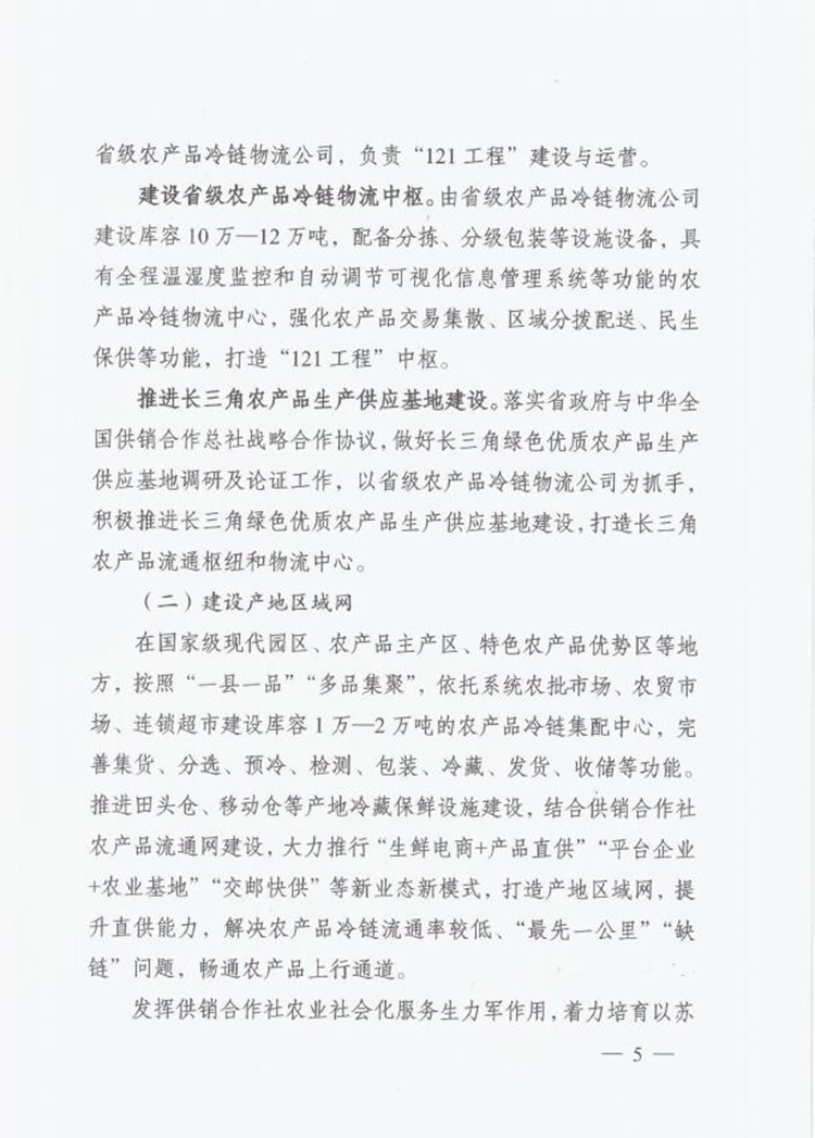 推進長三角農產品生產供應基地建設。落實省政府與中華全國供銷合作總社戰略合作協議,做好長三角綠色優質農產品生產供應基地調研及論證工作,以省級農產品冷鏈物流公司為抓手積極推進長三角綠色優質農產品生產供應基地建設,打造長三角農產品流通樞紐和物流中心。