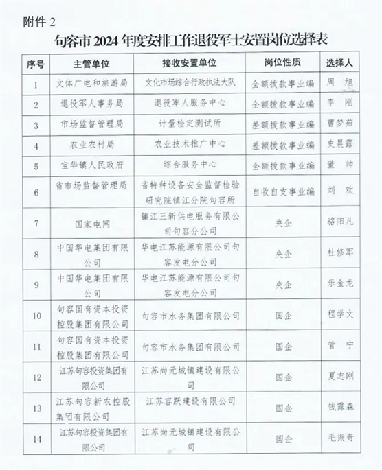 2.句容市2024年度安排工作退役軍士安置崗位選擇表
