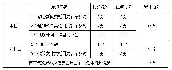 例如:某市氣象局網站信息公開目錄中,有2個欄目存在問題,具體問題類型、數量和扣分計算過程如下。該市氣象局本級信息公開目錄總體扣25分。