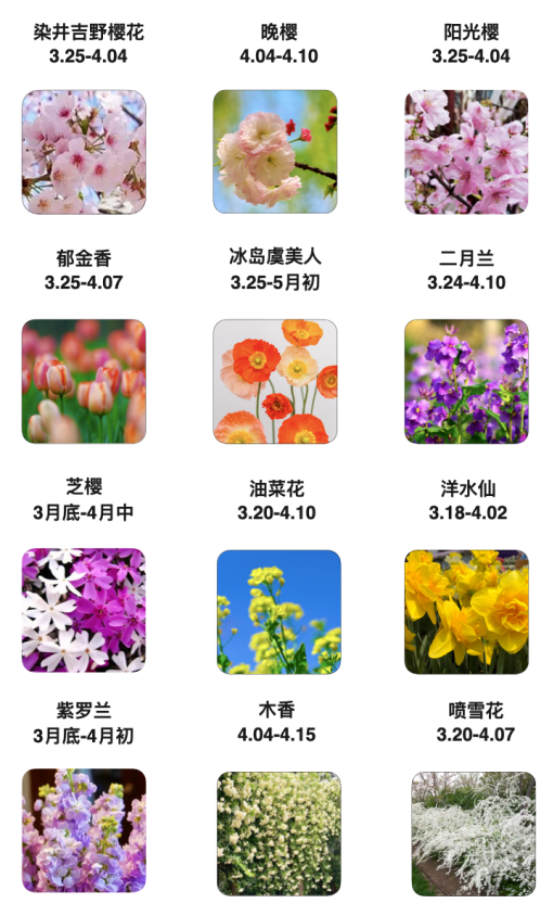 染井吉野櫻花/陽光櫻/郁金香/冰島虞美人/油菜花/噴雪花/洋水仙/二月蘭/喜林草