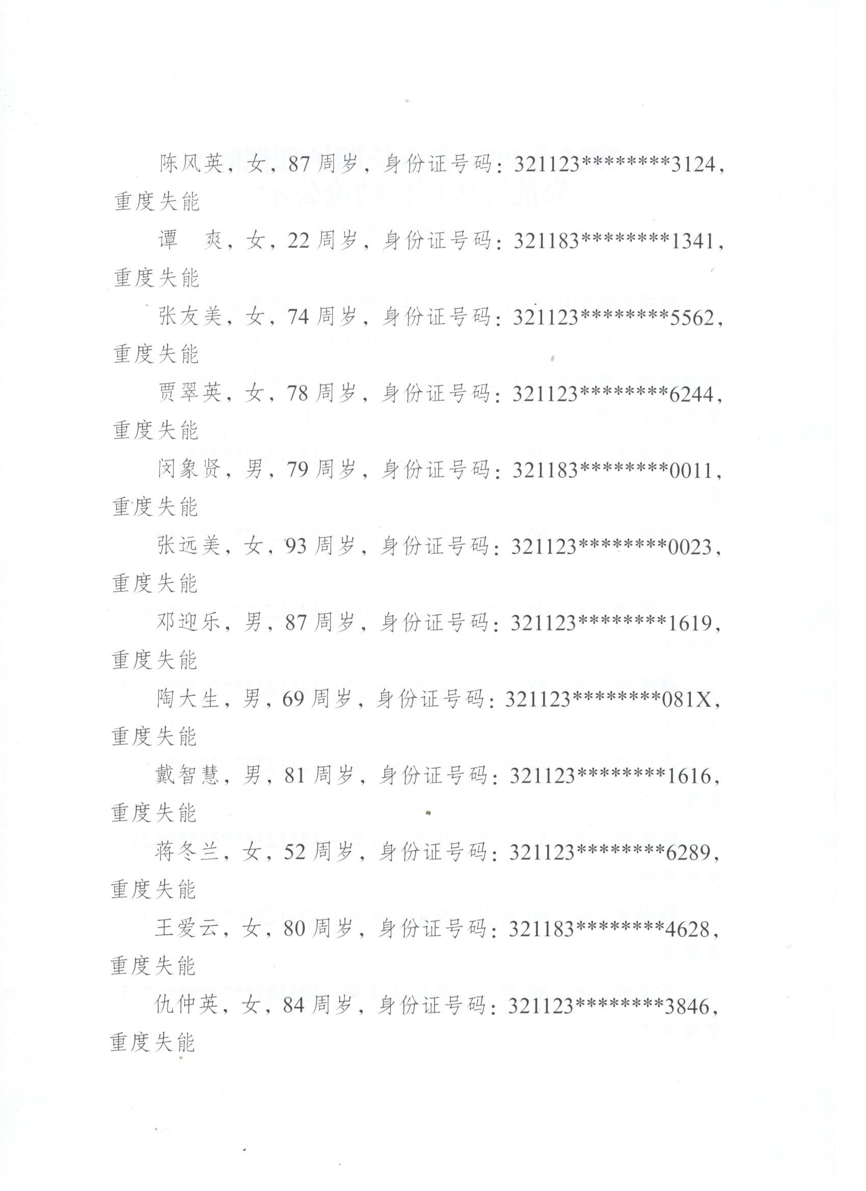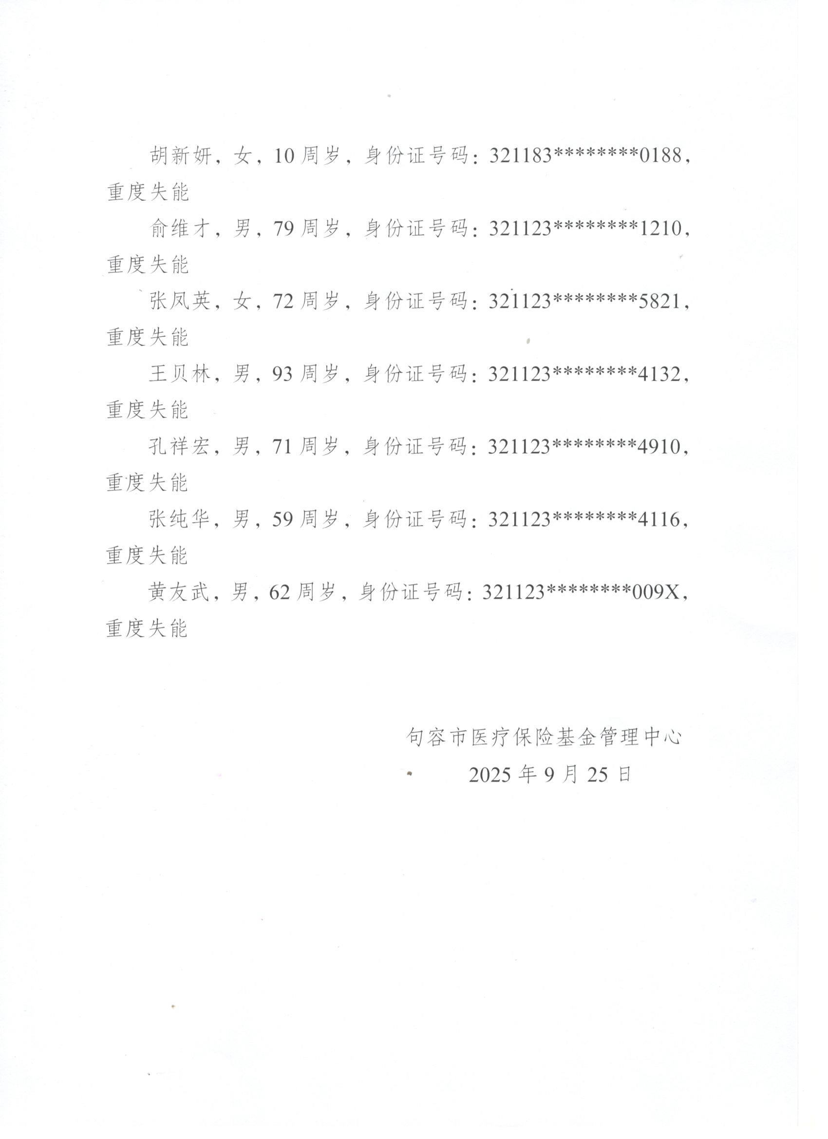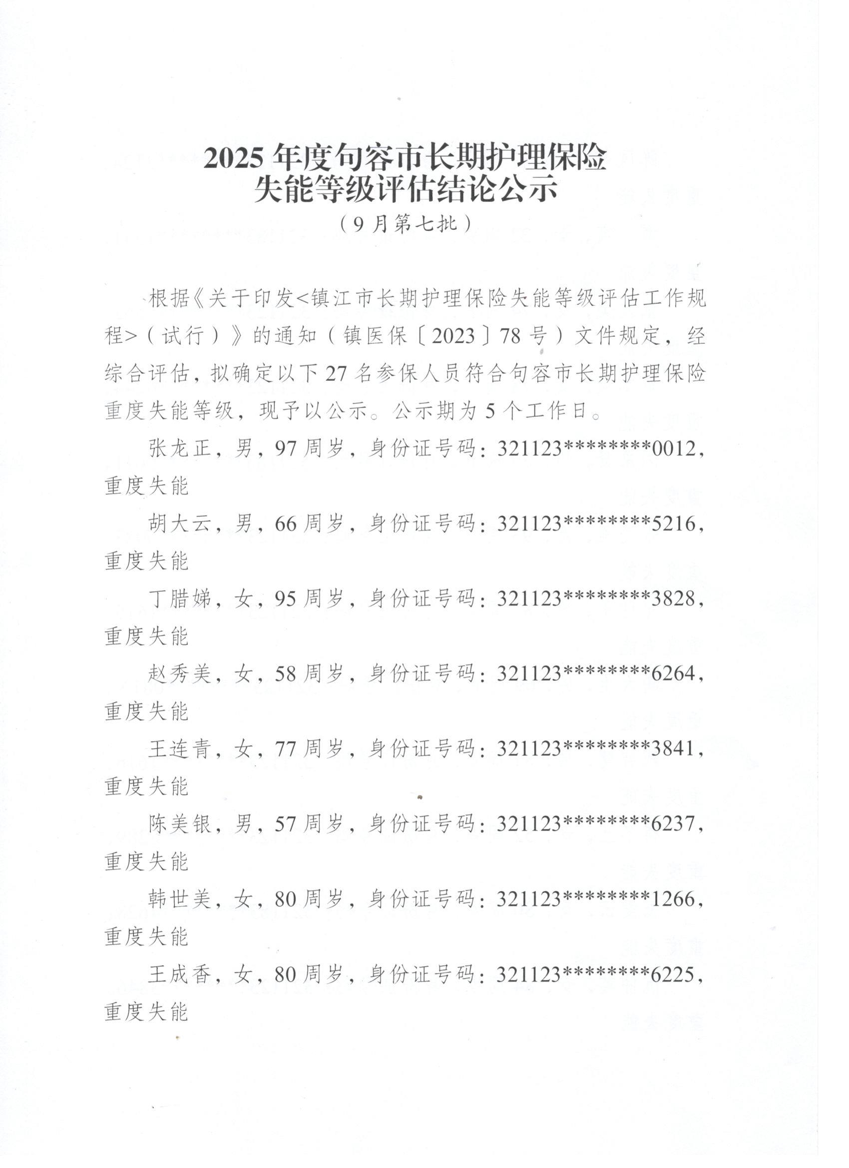 2025年度句容市長期護理保險失能等級評估結論公示(9月第七批)