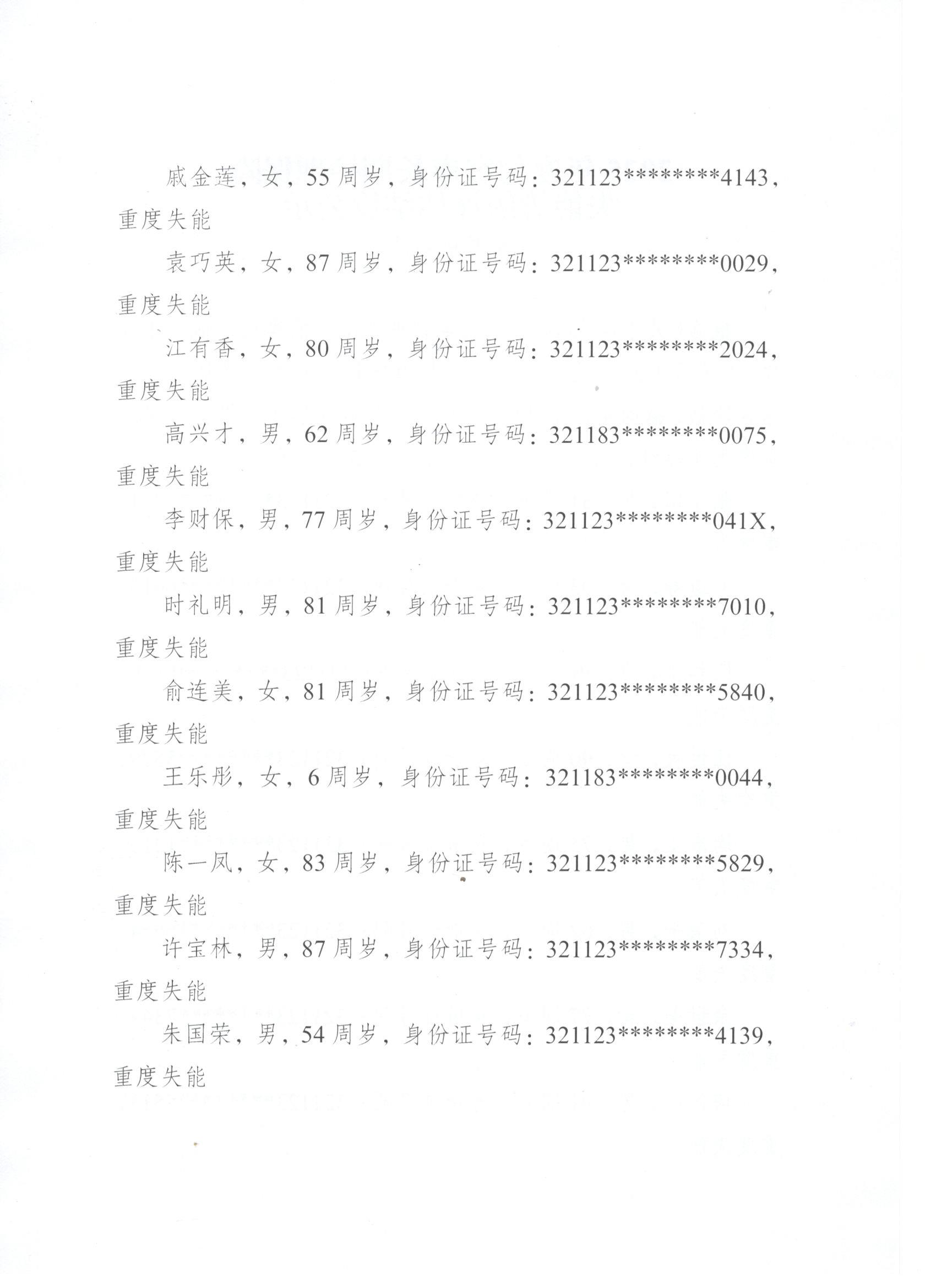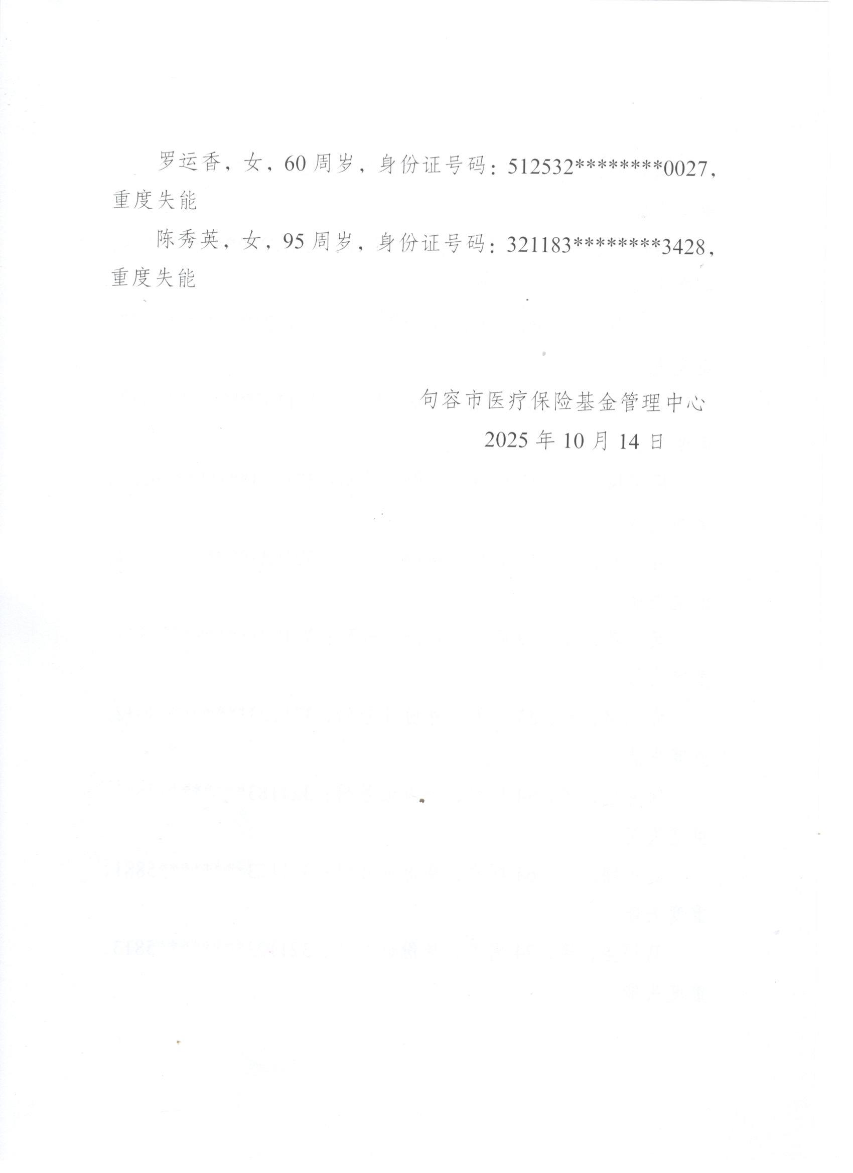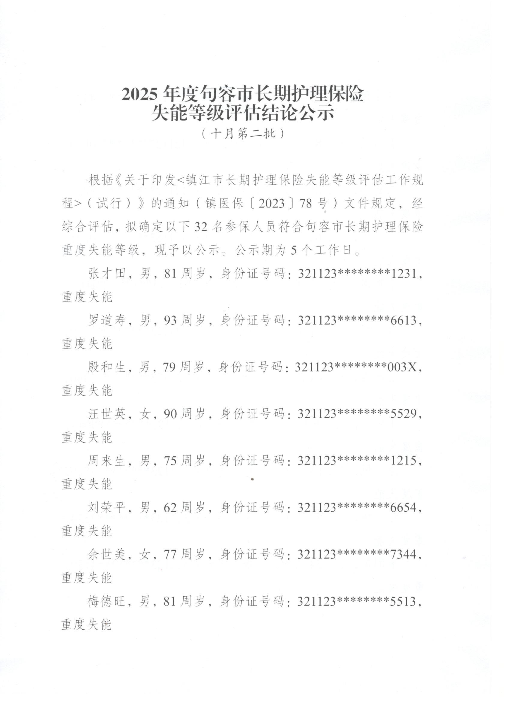 2025年度句容市長期護理保險失能等級評估結論公示(10月第二批)