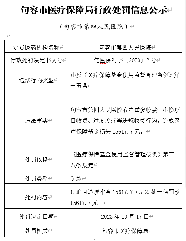 句容市醫(yī)療保障局行政處罰信息公示(句容市第四人民醫(yī)院)
